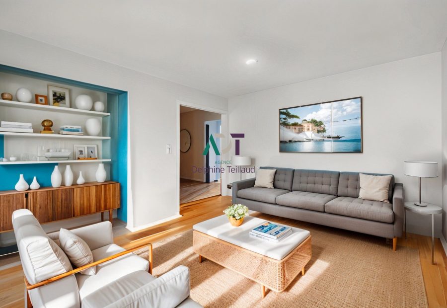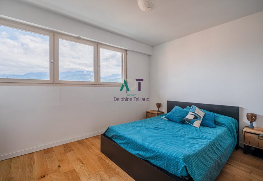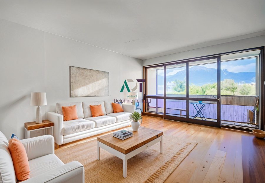Un vaste hall d'entrée dessert l'ensemble de l'appartement. Le séjour spacieux s’ouvre sur un balcon offrant une vue dégagée sur les montagnes et le parc arboré de la copropriété. Deux chambres confortables, une salle d’eau, des WC séparés, ainsi qu’une cuisine semi-équipée complètent ce bien à la configuration fonctionnelle.