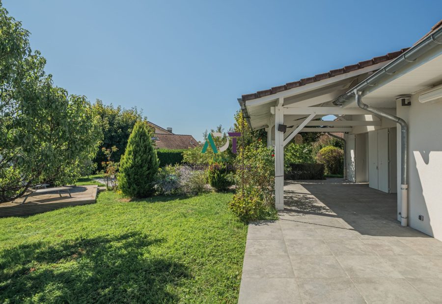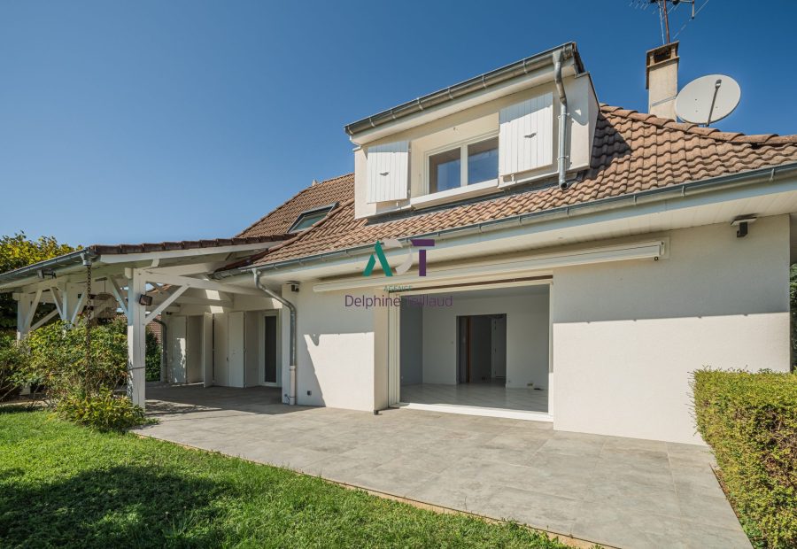 Au rez-de-chaussée : Une cuisine indépendante équipée, une pièce de vie lumineuse salon/salle à manger avec baie vitrée sur terrasse, 3 chambres, une salle de bains avec baignoire + douche à l’italienne, un WC indépendant