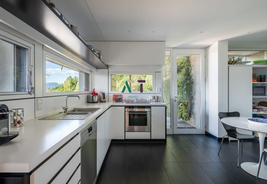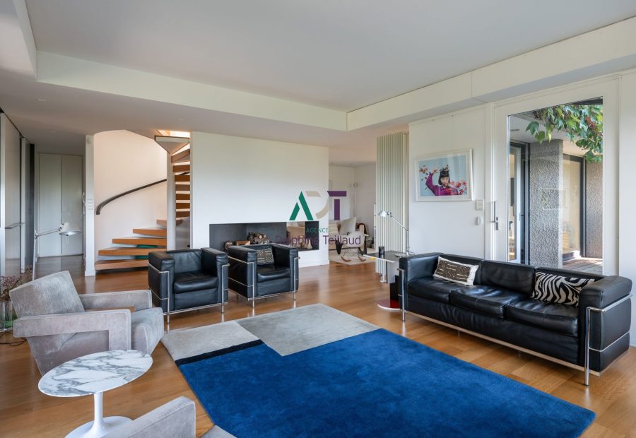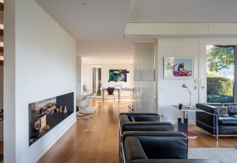D’une surface habitable d’environ 220 m², la maison se distingue par son architecture audacieuse, baignée de lumière grâce à ses larges ouvertures sur la nature et ses terrasses.La vaste pièce de vie invite à la convivialité et à la contemplation, tandis que les quatre chambres et deux bureaux offrent confort et fonctionnalité pour toute la famille.