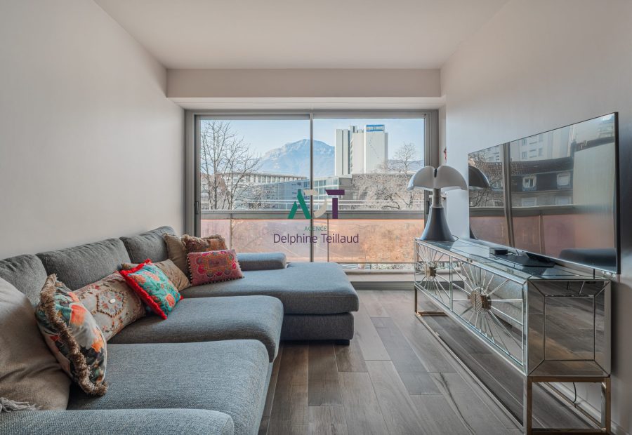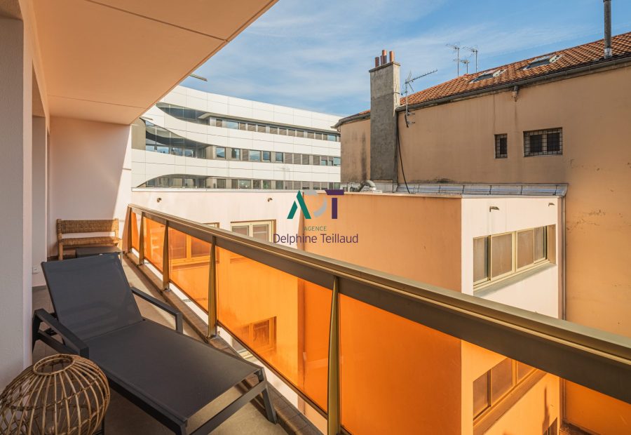 La pièce de vie de 42 m² se compose d'un salon, d'une salle à manger et d'une cuisine entièrement équipée avec un îlot central. Un balcon filant et une terrasse sont accessibles en exposition sud ouest