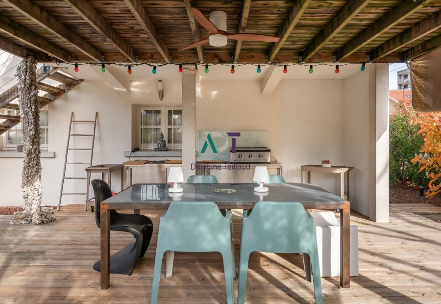 L'extérieur est sans conteste l’atout charme de cette maison ! Le jardin soigné de 434 m², entièrement clos, est un véritable écrin de verdure, parfait pour des barbecues d'été, agrémenté d'une cuisine d'été protégée et d'une piscine avec une vue magnifique sur le Moucherotte.