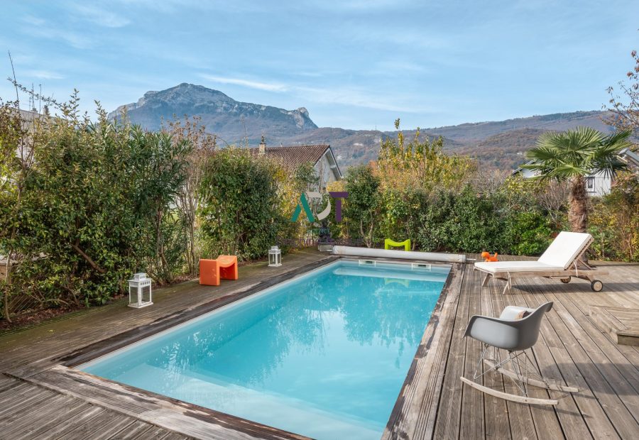 L'extérieur est sans conteste l’atout charme de cette maison ! Le jardin soigné de 434 m², entièrement clos, est un véritable écrin de verdure, parfait pour des barbecues d'été, agrémenté d'une cuisine d'été protégée et d'une piscine avec une vue magnifique sur le Moucherotte.