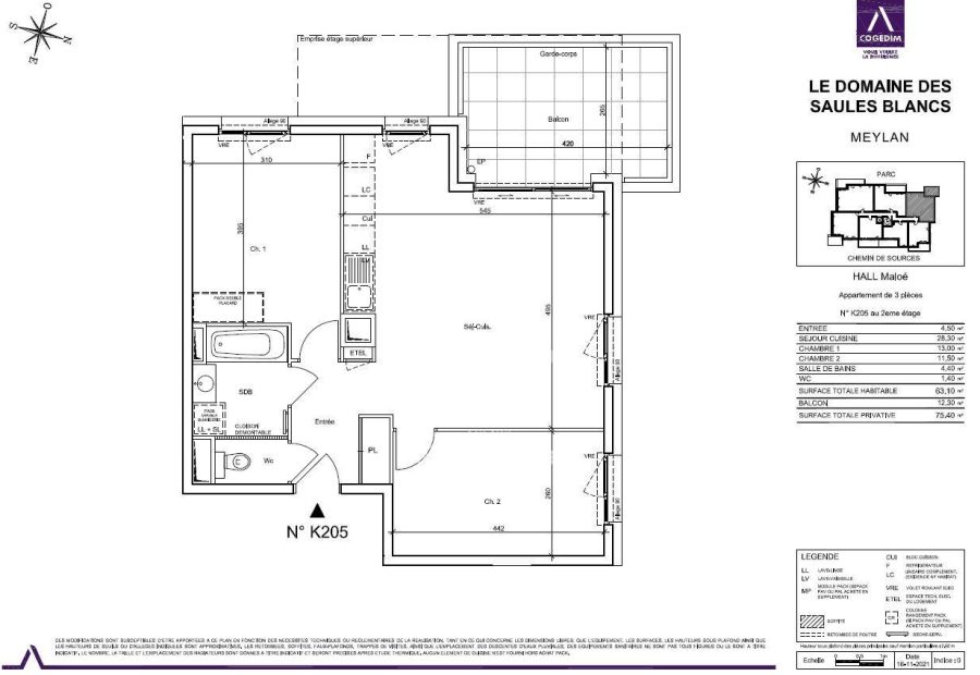 T3 K205+GGE 43 - T3 de 63m² dans Résidence récente (2024)- situé au DOMAINE DES SAULES BLANCS - 6 chemin des sources. A proximité de toutes les commodités, transports en commun, commerces et axes routiers. Appartement au 2ème étage disposant d'un balcon de 12m². Cuisine ouverte sur séjour de 28m² (aménagée et équipée d'une hotte et de plaques de cuisson ). 2 chambres . Entrée avec placard mural. Salle de bain avec meuble vasque, sèche serviette et miroir. WC séparé. Garage privatif en sous sol. Chauffage et eau chaude collectifs avec sous comptage individuelle. Classe énergie B (nouveau DPE). Libre mi février. Bien soumis au régime de défiscalisation PINEL avec conditions de ressources. Le bien est soumis au statut de la copropriété , la copropriété comporte 2 lots. Loyer de 1 059,00 euros par mois charges comprises dont 98,00 euros par mois de provision pour charges (soumis à la régularisation annuelle). Les honoraires charge locataire sont de 695,99 euros ( soit 11,03 euros/m² ) dont 191,19 euros pour état des lieux ( soit 3,03 euros/m² ). Montant estimé des dépenses annuelles d'énergie pour un usage standard : entre 330 et 447 euros. Prix moyens des énergies indexés en 2021. Zone soumise à encadrement des loyers. Le loyer de base du bien proposé est de 961 euros, le loyer de référence majoré (fixé par arrêté préfectoral) est de 883,4 euros et le complément de loyer est de 79 euros par mois.Les informations sur les risques auxquels ce bien est exposé sont disponibles sur le site Géorisques : https://www.georisques.gouv.fr