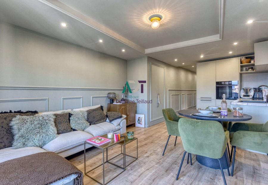 Le séjour lumineux s’ouvre sur une cuisine équipée, offrant un espace convivial et baigné de lumière naturelle. Depuis les fenêtres en double vitrage PVC, profitez d’une vue exceptionnelle sur les toits grenoblois, avec, en toile de fond, la majestueuse chaîne de Belledonne.