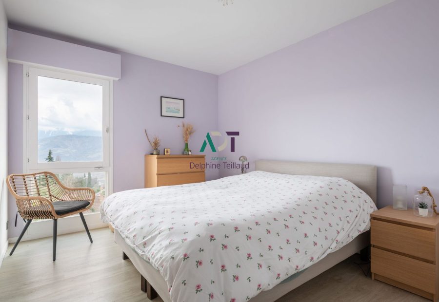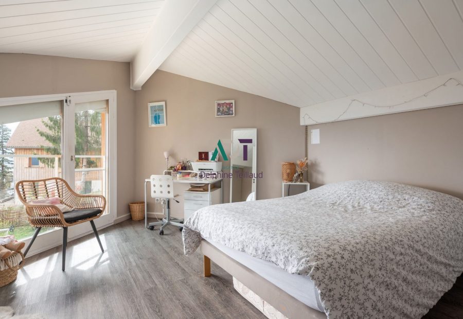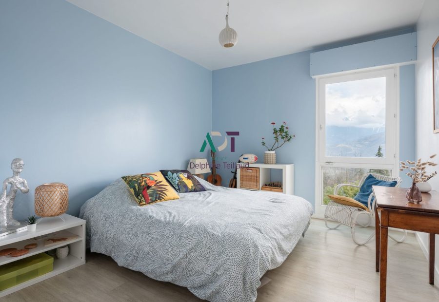 Au rez-de-chaussée, une entrée avec placards dessert une belle pièce de vie ouverte et lumineuse. Le salon est organisé autour du poêle, l'espace dinatoire tourné vers la terrasse et la cuisine ouverte bénéficie d'une vue panoramique sur la chaîne de Belledonne. A cet étage également, un premier espace nuit : deux chambres avec placards, une salle d'eau et un wc séparé. La distribution de cet étage permet une intimité de chacun tout en étant à proximité des lieux où l'on se retrouve.