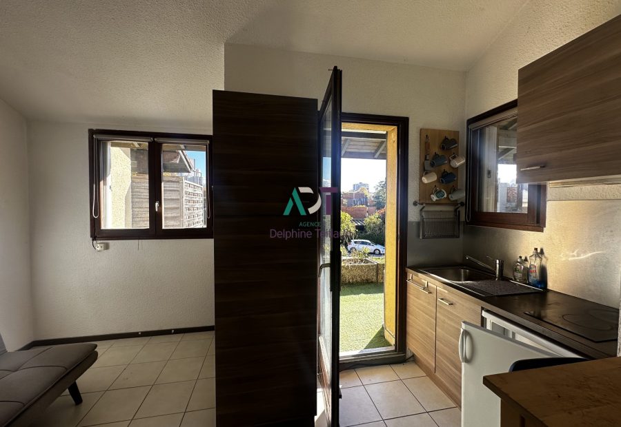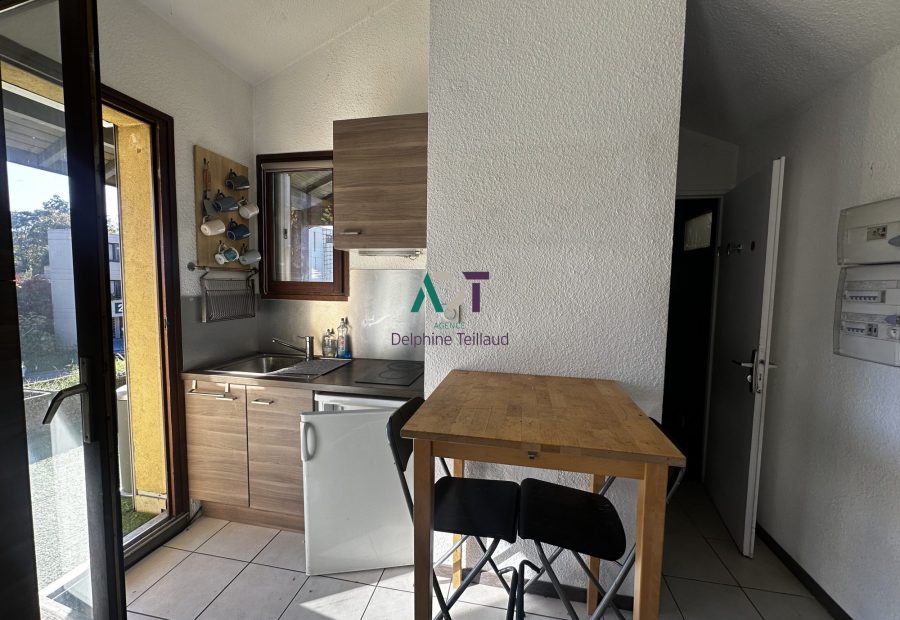 L’appartement se compose d’un espace de vie lumineux intégrant une pièce principale/chambre, une kitchenette équipée, et un coin dinatoire.Le tout s’ouvre sur une superbe terrasse ensoleillée, dont une partie est abritée, idéale pour installer un salon de jardin.