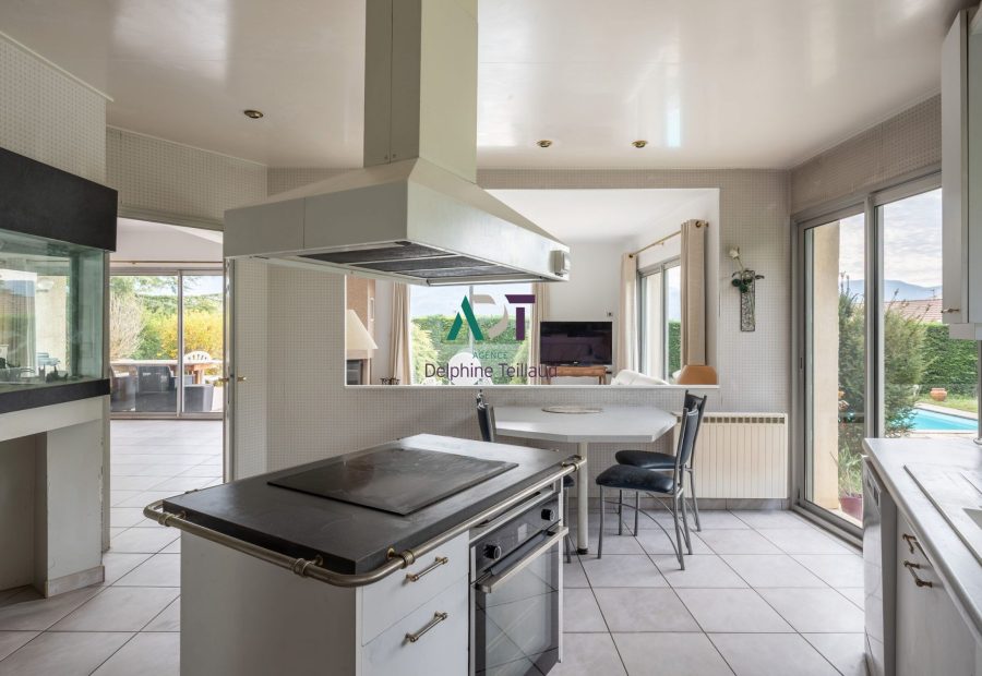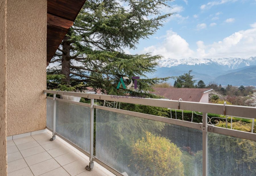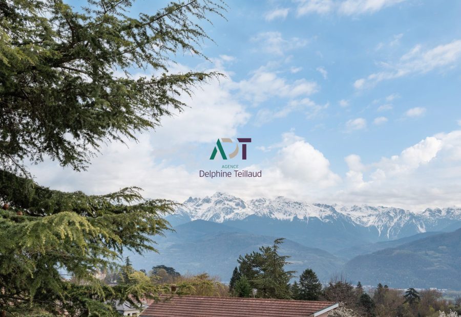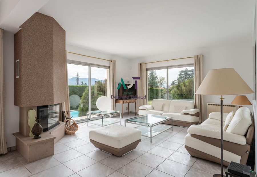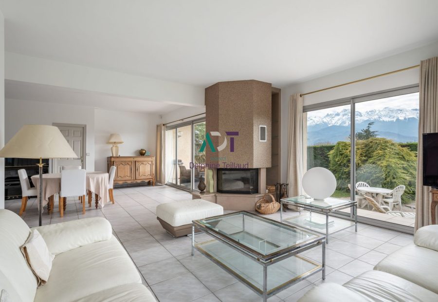 Au rez-de-chaussée : séjour spacieux de 45 m² exposé plein sud avec larges baies vitrées offrant une vue panoramique sur la chaîne de Belledonne, cheminée avec insert.