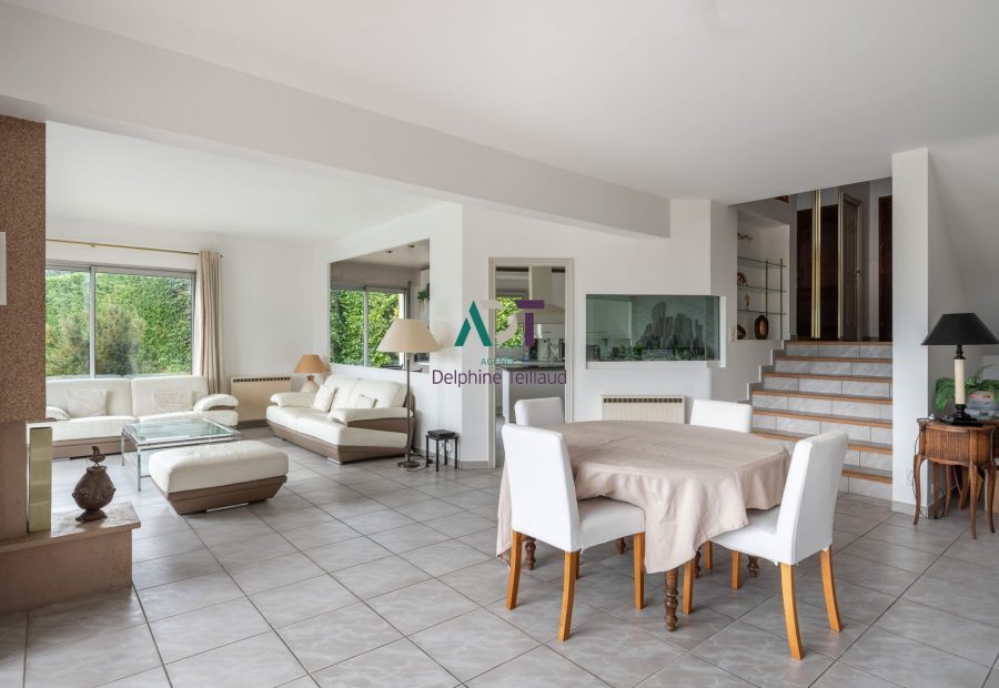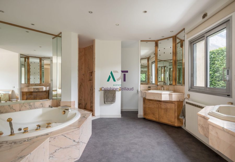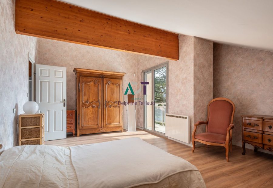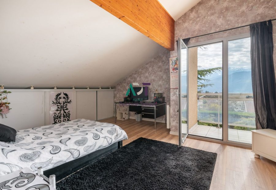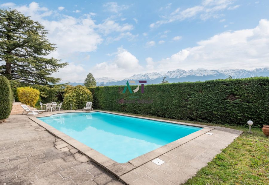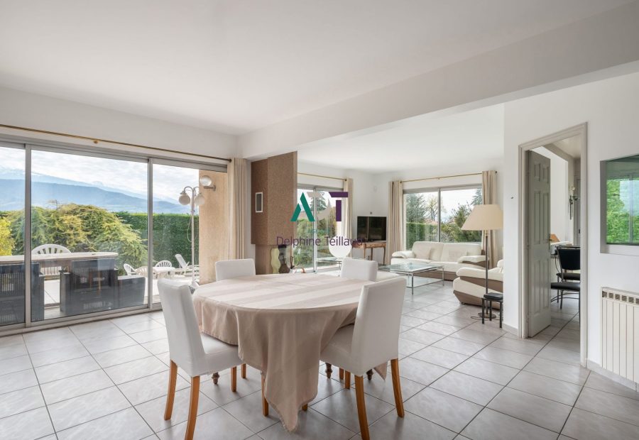 Au rez-de-chaussée : séjour spacieux de 45 m² exposé plein sud avec larges baies vitrées offrant une vue panoramique sur la chaîne de Belledonne, cheminée avec insert.