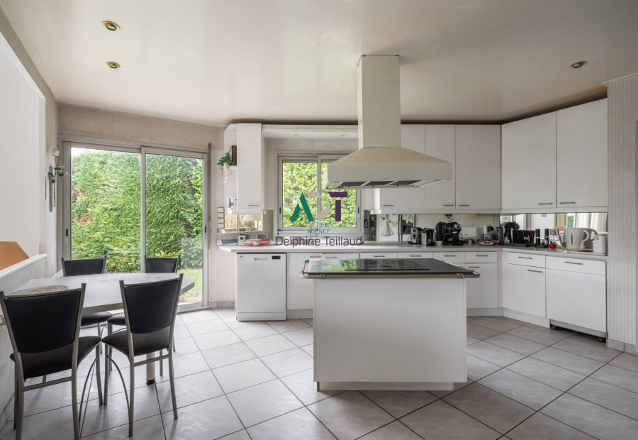 Une cuisine de 19 m² avec îlot central, accès direct au jardin, cellier/arrière cuisine de 4 m²