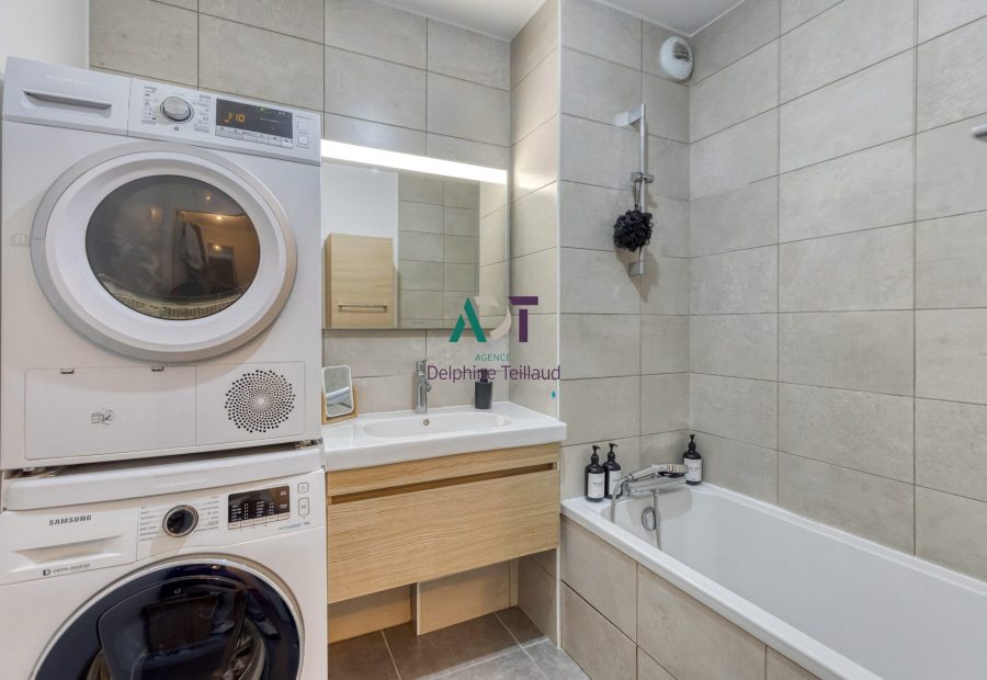 L’espace de vie s’organise autour d’une cuisine moderne entièrement intégrée, ouverte sur un séjour confortable et fonctionnel. La partie nuit propose deux chambres équipées de placards intégrés, pensées pour un rangement optimal. Une salle d’eau spacieuse complète l’ensemble avec des prestations soignées.